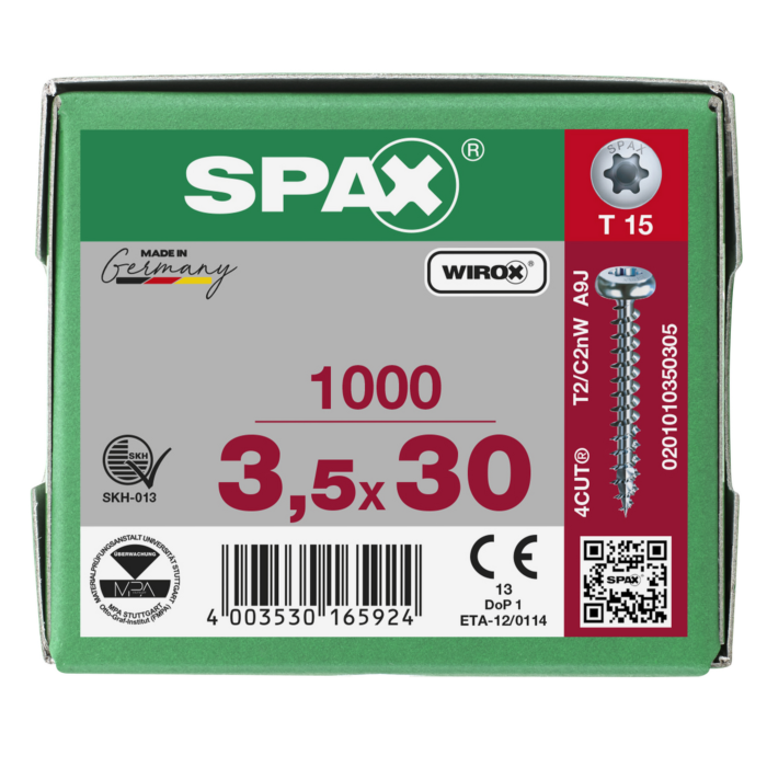 Spax spaanplaatschroeven T15 cilinderkop verzinkt 3.5 x 30 mm voldraad 1000 stuks