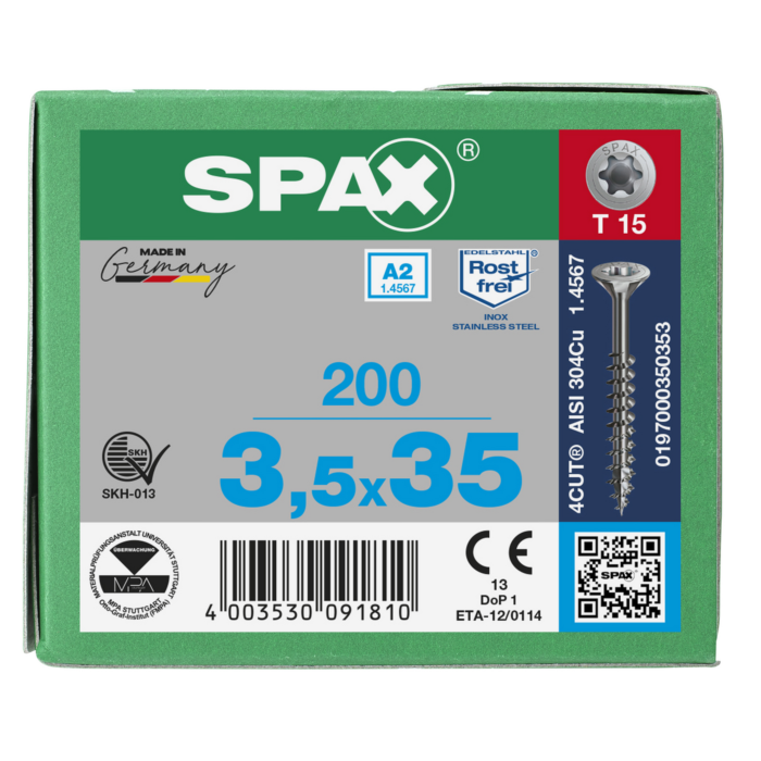 Spax spaanplaatschroeven T15 RVS A2 3.5 x 35 mm deeldraad 200 stuks