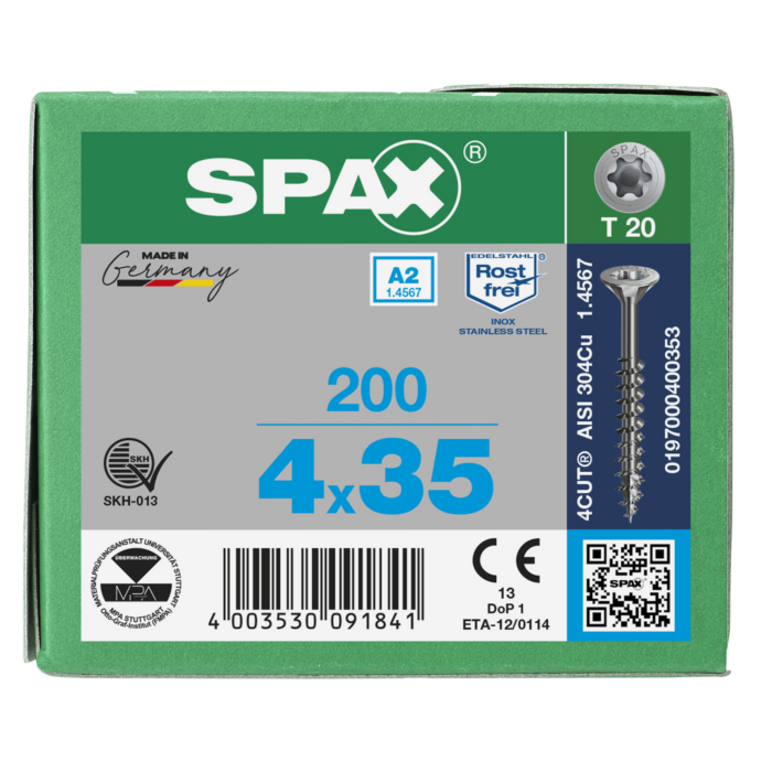 Spax spaanplaatschroeven T20 RVS A2 4 x 35 mm deeldraad 200 stuks