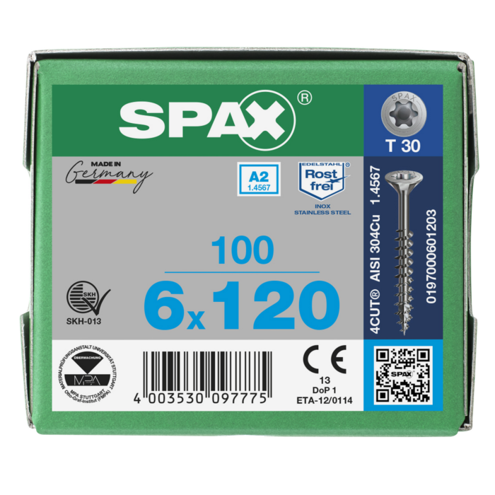Spax spaanplaatschroeven T30 RVS A2 6 x 120 mm deeldraad 100 stuks