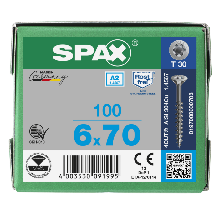 Spax spaanplaatschroeven T30 RVS A2 6 x 70 mm deeldraad 100 stuks